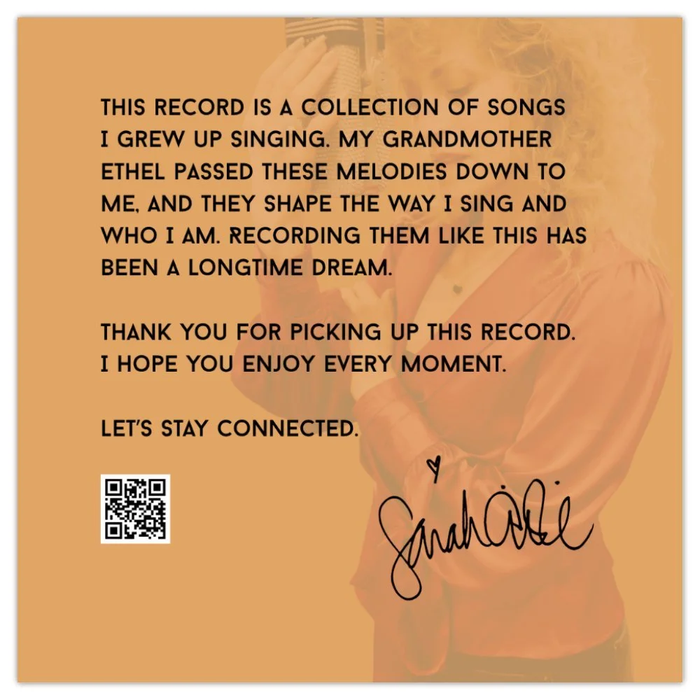 These songs have lived in me since childhood, learned at the piano with my grandmother Ethel before I knew what they meant, only that I loved singing them. Now in Nashville with my favorite musicians, I’m finally recording them as I’ve always heard them. While recording, my daughter Hazel was quietly coming—a reminder that life unfolds and timing matters. This record is a return, a beginning, and I’m proud to share it with you